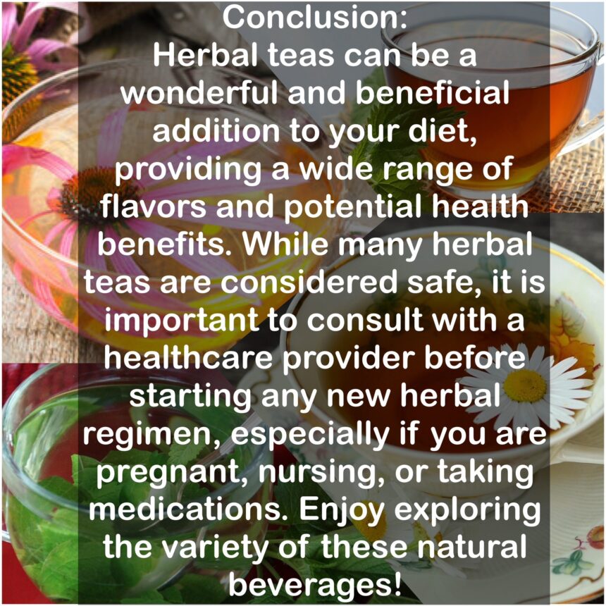 Herbal teas can be a wonderful and beneficial addition to your diet, providing a wide range of flavors and potential health benefits. While many herbal teas are considered safe, it is important to consult with a healthcare provider before starting any new herbal regimen, especially if you are pregnant, nursing, or taking medications. Enjoy exploring the variety of these natural beverages!