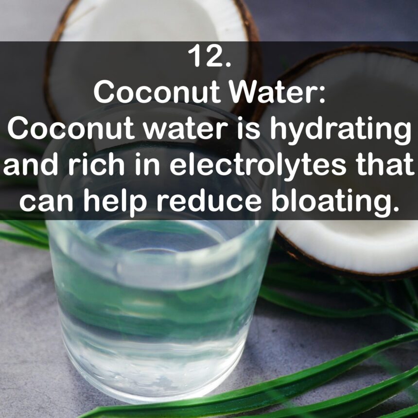 Anti-Bloating Drink: Coconut water Lewis Leave a comment Previous Next Follow us 12. Coconut Water: Coconut water is hydrating and rich in electrolytes that can help reduce bloating. Follow us Return to Anti-Bloating Drink: Coconut water