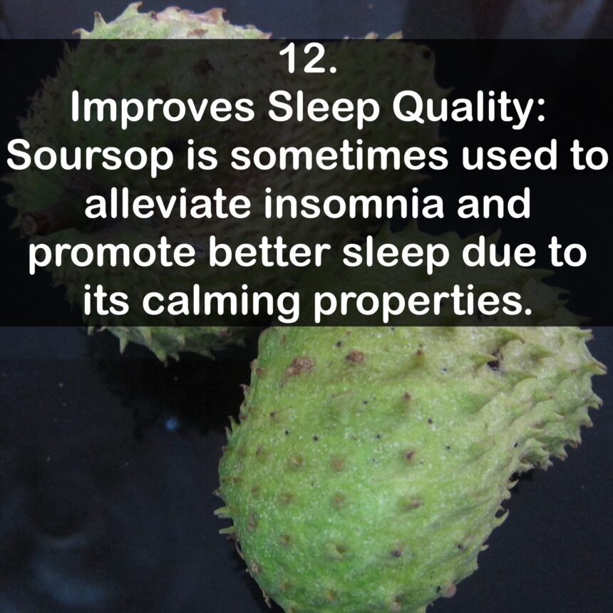 Soursop Benefit: Improves Sleep Quality Lewis Leave a comment Previous Next Follow us 12. Improves Sleep Quality: Soursop is sometimes used to alleviate insomnia and promote better sleep due to its calming properties. Follow us Return to Soursop Benefit: Improves Sleep Quality