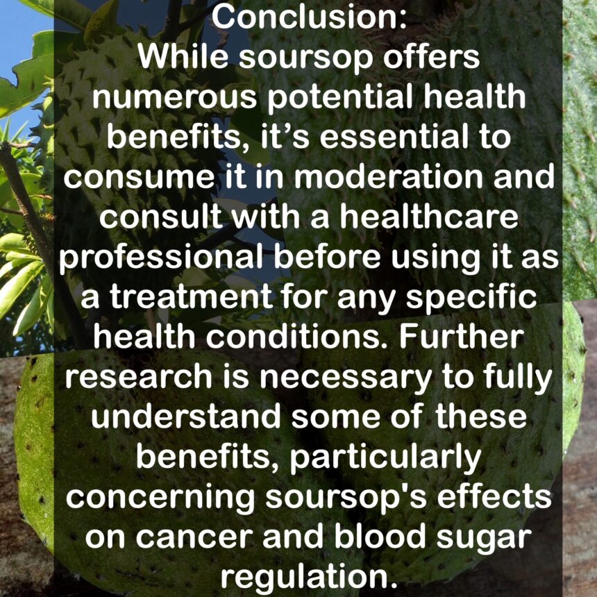 Conclusion: While soursop offers numerous potential health benefits, it’s essential to consume it in moderation and consult with a healthcare professional before using it as a treatment for any specific health conditions. Further research is necessary to fully understand some of these benefits, particularly concerning soursop’s effects on cancer and blood sugar regulation.