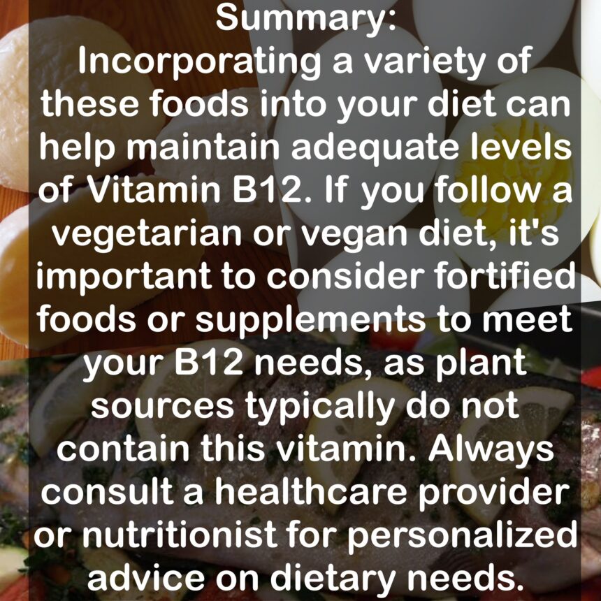 Summary: Incorporating a variety of these foods into your diet can help maintain adequate levels of Vitamin B12. If you follow a vegetarian or vegan diet, it’s important to consider fortified foods or supplements to meet your B12 needs, as plant sources typically do not contain this vitamin. Always consult a healthcare provider or nutritionist for personalized advice on dietary needs.