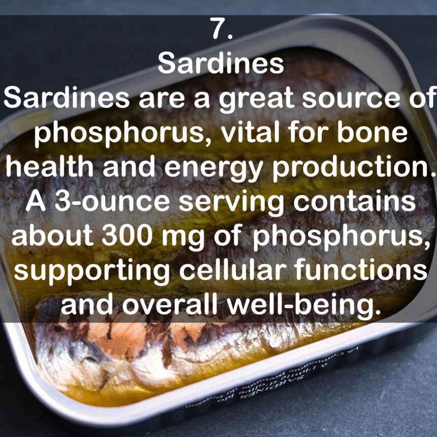 7. Sardines: Sardines are a great source of phosphorus, vital for bone health and energy production. A 3-ounce serving contains about 300 mg of phosphorus, supporting cellular functions and overall well-being.