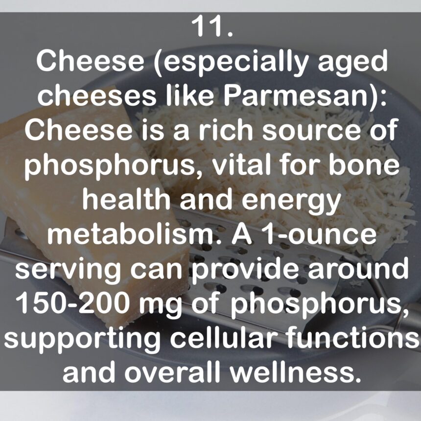 11. Cheese (especially aged cheeses like Parmesan): Cheese is a rich source of phosphorus, vital for bone health and energy metabolism. A 1-ounce serving can provide around 150-200 mg of phosphorus, supporting cellular functions and overall wellness.