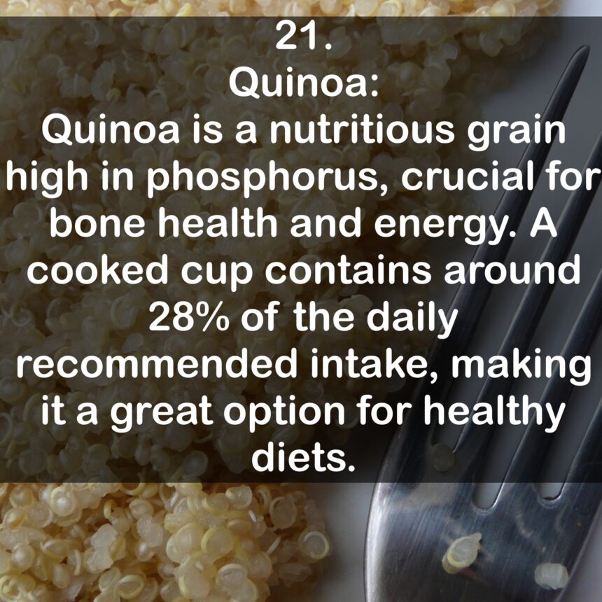 21. Quinoa: Quinoa is a nutritious grain high in phosphorus, crucial for bone health and energy. A cooked cup contains around 28% of the daily