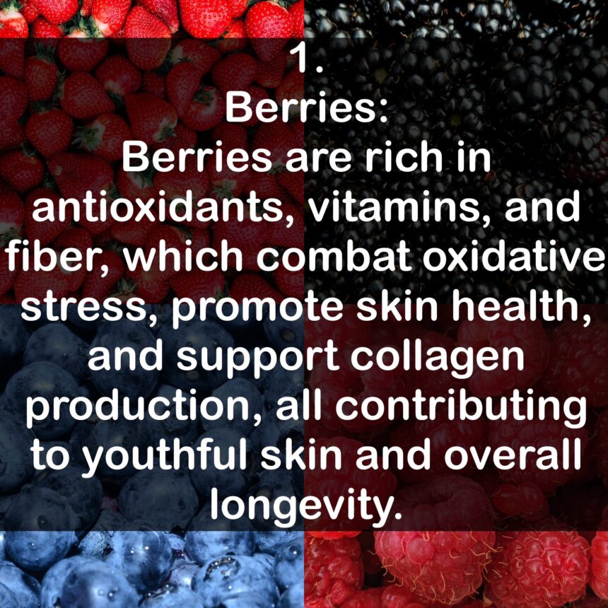 Berries are rich in antioxidants, vitamins, and fiber, which combat oxidative stress, promote skin health, and support collagen production, all contributing to youthful skin and overall longevity.
